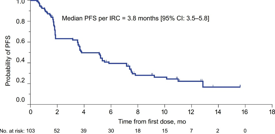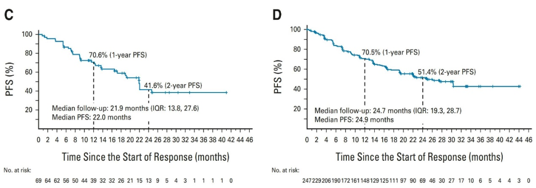 69例初治患者中,独立评审委员会评估的ORR为84%,包括6%的患者评估为CR,中位响应持续时间为20.2个月,数据分析时,40%的患者响应仍然持续,中位至响应出现时间为1.8个月,中位PFS为22.0个月,35%的患者仍然没有出现PFS事件,1年及2年的PFS率分别为70.6%和41.6%,中位OS未达到,2年OS率69%;247例经治患者,ORR为61%,包括7%的患者评估为CR,中位DOR为28.6个月,数据分析时,49%的患者响应仍然持续,中位至响应出现时间1.9个月,中位PFS为24.7个月,1年和2年PFS率分别为70.5%和51.4%,中位OS未达到,2年OS率为69%。