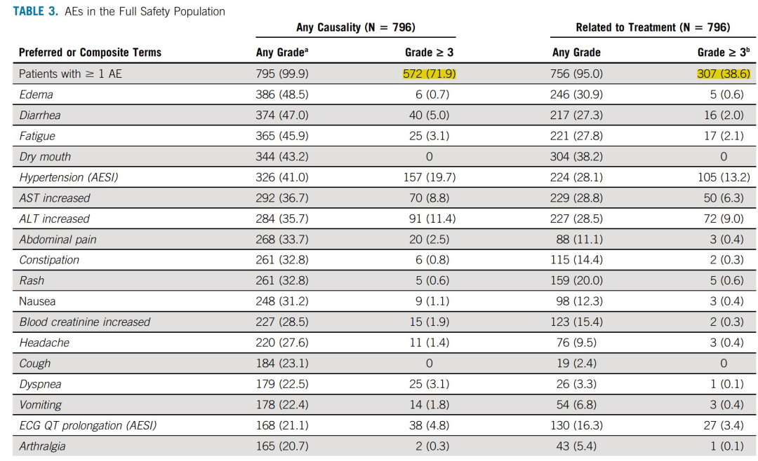 从安全性看,3度及以上全因不良反应发生率为71.9%,最常见的3度及以上全因不良反应分别为高血压19.7%,谷丙转氨酶升高11.4%,谷草转氨酶升高8.8%,腹泻5.0%,QT间期延长4.8%;最常见的3度及以上治疗相关不良反应包括高血压13.2%、谷丙转氨酶升高6.3%、谷草转氨酶升高9.0%,全因严重不良反应发生率为44%,其中11%的患者考虑与研究药物有关。