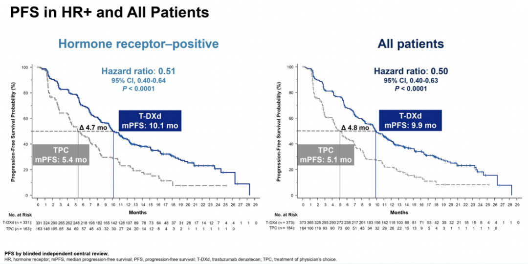 DESTINY-Breast04(DB-04)研究是首个探讨T-DXd治疗HER2-low mBC的Ⅲ期临床试验,将入组患者被随机分到T-DXd或医生选择的化疗方案(TPC)组分别接受治疗,结果显示,与TPC组相比T-DXd可显著延长HR+/HER2-low患者的PFS(10.1个月vs 5.4个月;P<0.0001)和所有患者的mPFS(9.9个月vs 5.1个月,P<0.0001),OS也有显著的延长。探索性分析显示,T-DXd组也能够显著改善HR-/HER2-low患者的PFS和OS。