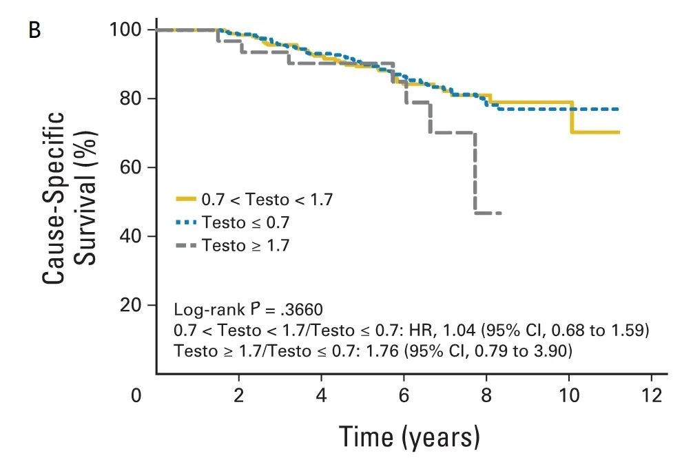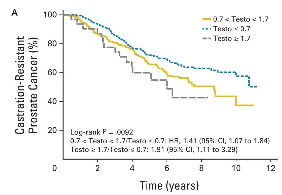 一项纳入153例前列腺癌患者的单中心、前瞻性、单臂队列研究结果显示,相比于睾酮>20 ng/dl,睾酮<20 ng/dl的患者死亡风险降低81%,疾病进展风险也有降低趋势,而50 ng/dl阈值线与死亡风险和进展风险均无关[4]。