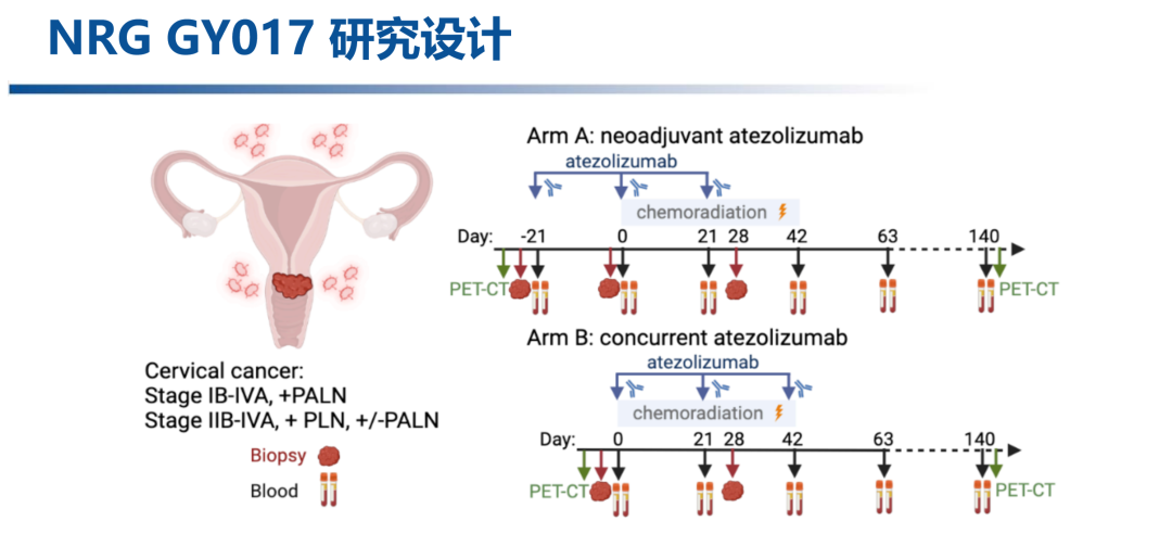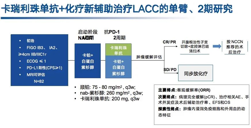今年SGO大会报道的1期NRG GY017研究[1],探讨了两种治疗模式:在CRT前给予1个周期的阿替利珠单抗诱导治疗,随后在CRT期间联合2个周期阿替利珠单抗(A组);或CRT期间联合3个周期阿替利珠单抗(B组)。研究结果显示两种给药模式的安全性良好,且均观察到T细胞克隆扩增,A组和B组ORR分别为82%和36%,1年PFS率均为72%。该研究表明T细胞扩展似乎与免疫治疗给药顺序无关,但先用免治疗的缓解率更高,随后也有国内外免疫联合CRT的初步研究结果报道,例如2022年ASCO大会上的1期NiCOL研究显示纳武利尤单抗+CRT序贯纳武利尤单抗辅助治疗6个月,ORR为93.8%,1年PFS率为81.2%[2];今年ESMO大会还报道了一项河南省肿瘤医院开展的卡瑞丽珠单抗联合CRT用于LACC患者的2期研究,结果显示ORR和DCR达到96.0%(24/35)和100%(25/25)[3]。