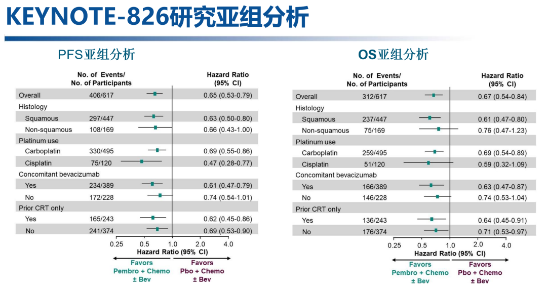 以化疗±贝伐珠单抗为主的复发或转移性宫颈癌一线治疗格局,已被KEYNOTE-826研究打破,2022版NCCN宫颈癌指南将帕博利珠单抗+化疗±贝伐珠单抗纳入一线治疗推荐[7]。去年ESMO大会报道该研究结果显示,在化疗±贝伐珠单抗基础上联合帕博利珠单抗可显著改善PFS(HR 0.65,95%CI:0.53~0.79;P<0.001)和OS(HR 0.67,95%CI:0.54~0.84;P<0.001),且无论PD-L1状态如何[8]。今年ASCO大会进一步报道了该研究的亚组分析,整体上不同亚组患者的PFS和OS均可从免疫联合治疗中获益,但鳞癌比非鳞癌(HR分别为0.61和0.76)、顺铂比卡铂(HR为0.59和0.69)、联合贝伐珠单抗比未联合贝伐珠单抗(HR为0.63和0.74)、既往仅CRT比非仅CRT(HR为0.64和0.71)的OS获益趋势更大[9]。此外,今年SGO大会报道该研究的患者报告结局(PRO)显示,免疫联合组的QLQ-C30 GHS/QoL评分有改善趋势(HR 0.84,95%CI:0.65~1.09;P=0.1851)、EQ-5D VAS评分有显著改善(HR 0.75,95%CI:0.58~0.97;P=0.0273)[10]
