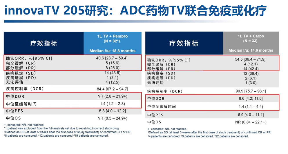 另一项来自欧洲的多中心2期innovaTV 205研究,在剂量扩展阶段采用Tisotumab vedotin(TV,一种靶向于组织因子的ADC药物)+帕博利珠单抗作为一线或者二/三线治疗,以及TV+卡铂作为一线治疗。结果显示,TV+帕博利珠单抗一线治疗的ORR和中位DoR分别为40.6%和NR,TV+卡铂则分别为54.5%和8.6个月,二者均显示了积极的抗肿瘤活性[12]。值得注意的是,近期举行的IGCS大会上报道了innovaTV 205研究将增加第4个队列,即TV+帕博利珠单抗+化疗±贝伐珠单抗[13]。在当前标准免疫联合治疗基础上再加入TV是否会提高疗效,其结果令人期待。