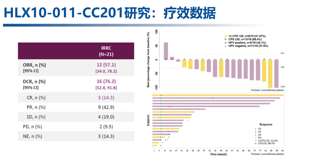 斯鲁利单抗是我国原研的PD-1抑制剂,在ASTRUM-010研究中,斯鲁利单抗用于经过治疗的MSI-H/dMMR实体瘤患者,显示了良好的抗肿瘤活性[16],并因此获得了国内相关适应症。2022年SGO大会口头报告的HLX10-011-CC201研究则进一步探讨了斯鲁利单抗用于晚期宫颈癌二线治疗的疗效和安全性[17]。这是一项由中国医学科学院肿瘤医院等国内22家中心开展的单臂2期研究,入组一线化疗失败或对一线治疗不耐受的PD-L1阳性(CPS≥1)晚期宫颈癌患者,接受每三周静脉输注斯鲁利单抗(4.5 mg/kg)+白蛋白紫杉醇(260 mg/m2),主要终点是IRRC评估的ORR和安全性。