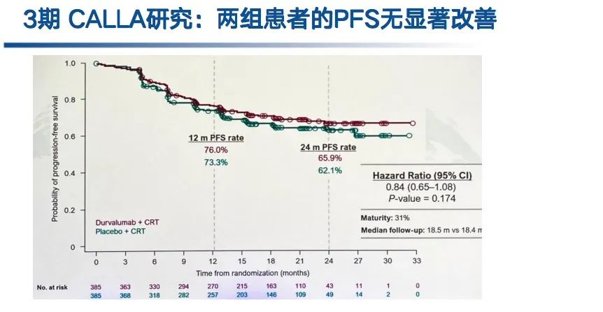 然而,近期IGCS大会报道的3期CALLA研究却没有得到阳性结果[4]。这项迄今CRT与免疫治疗的最大规模研究,纳入来自全球120个中心的770例高危LACC患者(FIGOⅠB2至ⅡB且N≥1;ⅢA至ⅣA且N≥0),随机接受度伐利尤单抗(1500 mg q4w×24 doses)或安慰剂联合铂类+外照射放疗(EBRT)+近距离放疗,主要终点是研究者评估的PFS。结果显示,度伐利尤单抗组与安慰剂组的PFS无显著差异,2年PFS率分别为65.9%和62.1%(HR 0.84,95%CI:0.65~1.08,P=0.174);关键次要终点OS虽然尚未成熟,但也没有显著差异(HR 0.78,95%CI:0.55~1.10,P=0.156);安全性相似,3/4级AE发生率分别为51.7%和51.0%。
