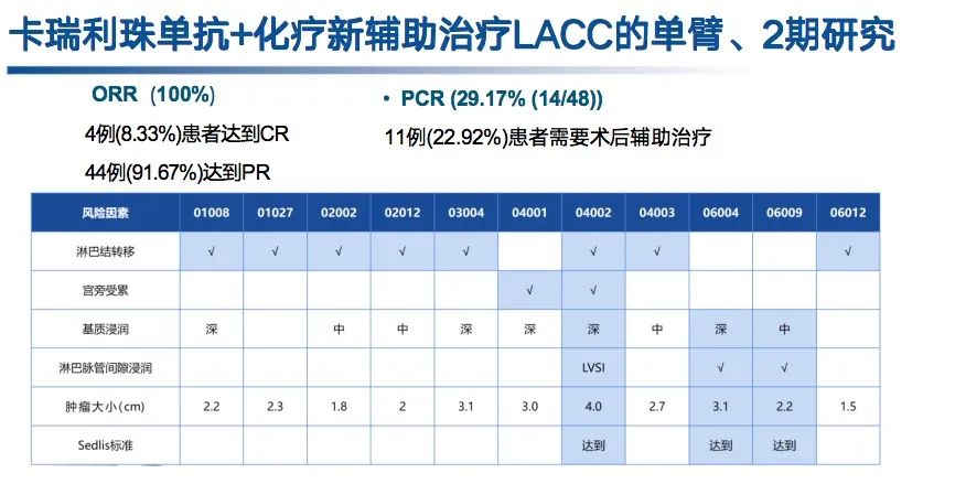 除了CRT以外,新辅助治疗、手术/放疗、辅助治疗也是LACC的探索模式。2022年ESMO大会报道了华中科技大学同济医学院附属同济医院团队开展的一项卡瑞利珠单抗联合化疗作为LACC新辅助治疗的单臂、2期研究[5]。这是首个报道的LACC新辅助免疫治疗研究,共纳入73例LACC患者(FIGOⅠB3、ⅠA2、≥4cmⅡB/ⅢC1r;),且PD-L1阳性(CPS≥1)。患者先接受1个周期化疗诱导,再接受2个周期的卡瑞利珠单抗+化疗,疗效评估CR/PR的患者接受手术(根据NCCN推荐术后辅助治疗),SD/PD患者则接受CRT。结果显示:ORR为100%,其中4例(8.33%)CR、44例(91.67%)PR;pCR率为29.17%,术后仅11例患者需行辅助治疗;大多数治疗相关AE为1/2级,包括白细胞减少、淋巴细胞减少、恶心、贫血及中性粒细胞减少等。