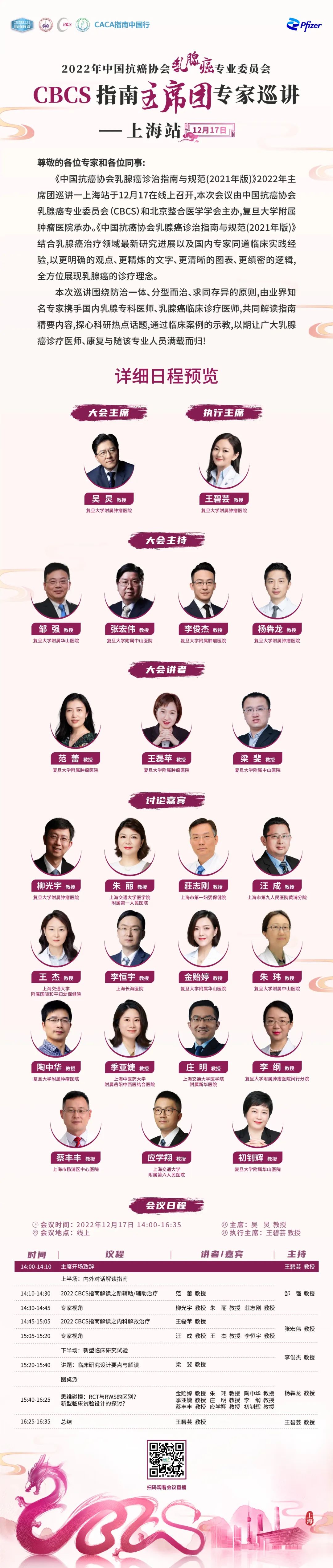 由中国抗癌协会乳腺癌专业委员会(CBCS)和北京整合医学会主办,复旦大学附属肿瘤医院承办的《中国抗癌协会乳腺癌诊治指南与规范(2021年版)》2022年主席团巡讲——上海站将于12月17日在线上召开。