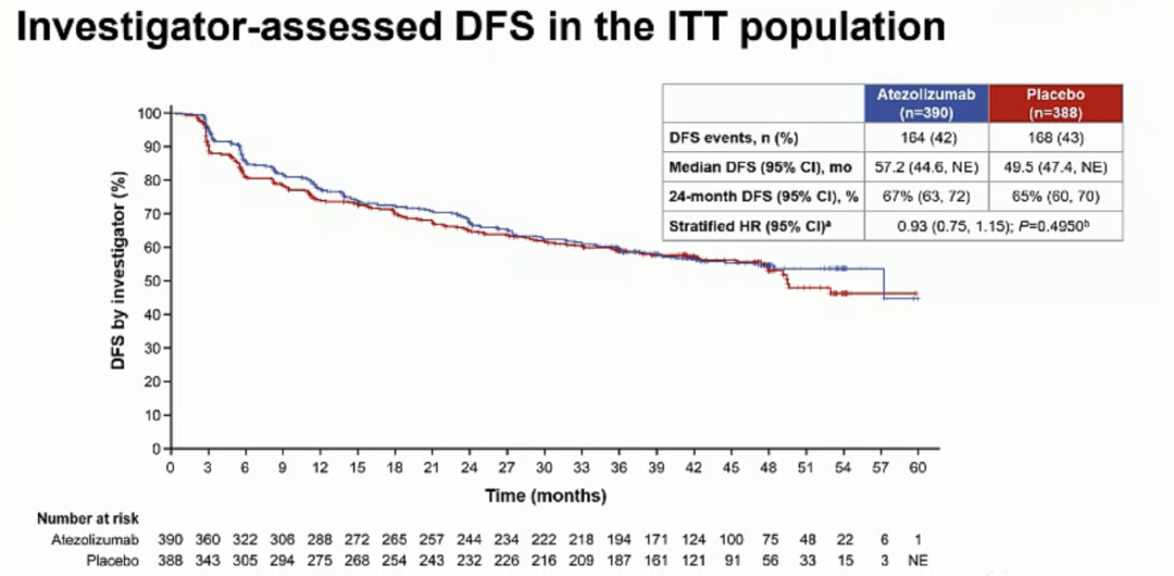 IMmotion 010是一项Ⅲ期、多中心、随机、安慰剂对照、双盲实验,评估了阿替利珠单抗(抗PD-L1单抗)单药在肾切除术后复发中高危患者,整体的研究设计与KEYNOTE-564类似,但并没有获得阳性结果,阿替利珠单抗的DFS并未较安慰剂组显著延长(57.2 vs 49.5个月;HR 0.93,95%CI:0.75~1.15;P=0.495)。
