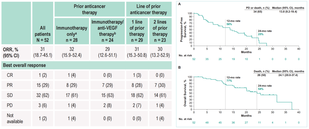 今年ASCO报道LITESPARK-001研究显示了积极的抗肿瘤活性,随后在ESMO大会报道的LITESPARK-003研究更是令人眼前一亮。这项Ⅱ期研究采用的是HIF-2α抑制剂MK-6482-001和多靶点TKI卡博替尼的双靶联合方案,结果非常惊艳。既往失败患者(队列2)的ORR为31%(其中免疫治疗失败后二线治疗的ORR也达到31%),PFS更是接近14个月,这应该是迄今为止晚期肾癌二线靶向治疗的最长PFS。