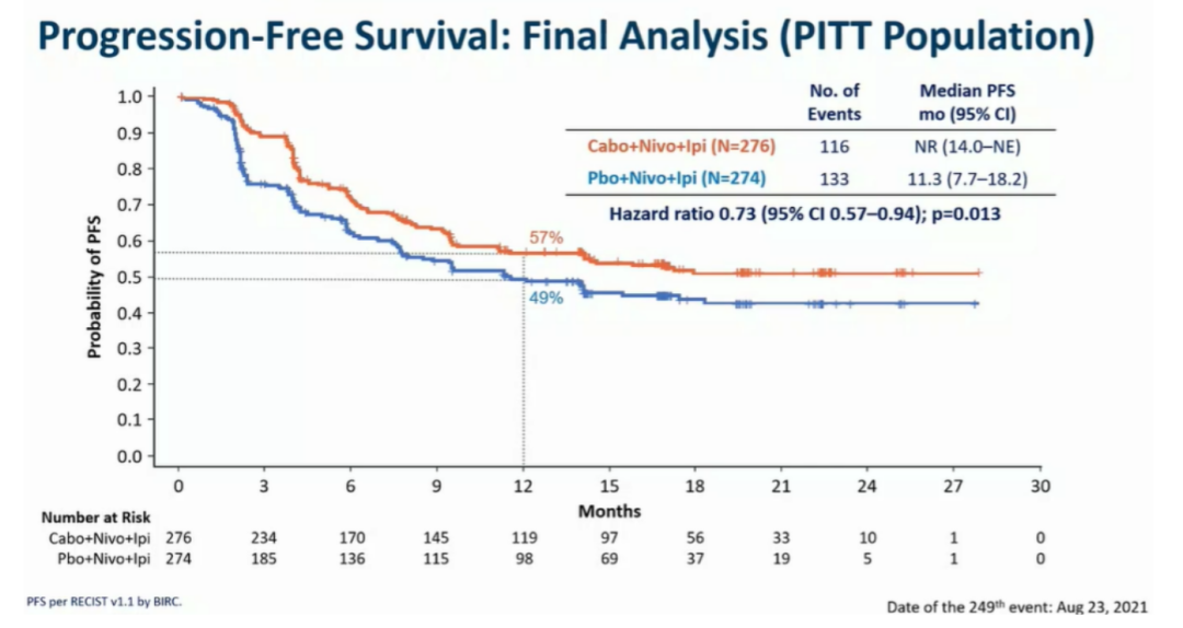 实际上,2022年ESMO还报道了一项双免联合加靶向治疗的COSMIC-313研究,评估卡博替尼联合纳武利尤单抗和伊匹木单抗(C+N+Y)对比N+Y用于既往未经治疗的、IMDC中高危晚期RCC患者的疗效和安全性。这项研究得到了相当不错的结果,C+N+Y组的ORR(43%vs 36%)、PFS(NR vs 11.3个月;HR 0.73:95%CI:0.57~0.94;P=0.013)。