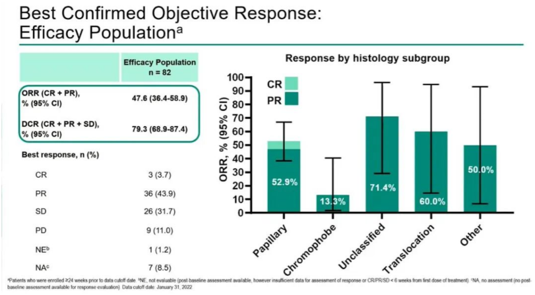 既往KEYNOTE-427研究显示帕博利珠单抗对nccRCC(队列B)患者的积极抗肿瘤活性,CLEAR研究则证实了“可乐组合”(帕博利珠单抗联合仑伐替尼)在ccRCC一线治疗的生存获益;今年ESMO报道的KEYNOTE-B61,进一步将帕博利珠单抗联合仑伐替尼用于nccRCC一线治疗。这项Ⅱ期单臂研究入组患者将近150例,是目前此类研究中样本量较大的。KEYNOTE-B61显示了非常不错的结果,ORR达到47.6%,有效率非常高,虽然PFS尚未成熟,但6个月PFS率已经达到72.3%,长期生存获益的希望很大。