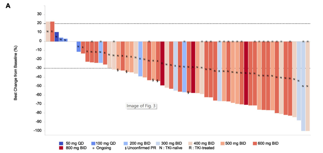 98.4%的患者出现全因任何级别不良反应,93.4%的不良反应考虑与治疗有关;3度及以上全因不良反应发生率为36.5%,其中,25.4%的不良反应考虑与治疗有关。无5级不良反应出现,最常见的治疗相关不良反应包括腹泻(任何级别82.5%;3度以上6.4%),恶心(82.5%,3.2%),呕吐(71.4%,3.2%),12.7%的患者因治疗相关的不良反应需要剂量修改。在剂量爬坡阶段,6例接受600 mg每日两次治疗的患者,出现1例剂量限制性毒性;3例接受800 mg,每日两次治疗的患者,出现1例剂量限制性毒性,800 mg每日两次剂量爬坡结束后,研究者决定不再进行额外的患者招募,因此研究未达到最大耐受剂量,后续推荐给药剂量为600 mg,口服,每日两次。