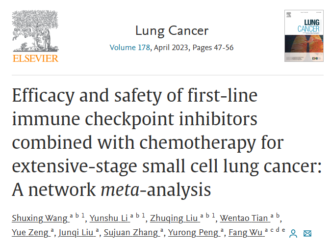 前言:《2023年度癌症报告》(Cancer Statistics 2023)显示:肺癌依然是第一致死癌症。小细胞肺癌(Small cell lung cancer,SCLC)是肺癌的一种特殊类型,属于恶性程度极高的神经内分泌肿瘤,约占所有肺癌的15%。SCLC在早期具有很高的转移潜力,因此70%以上的患者在诊断时即处于广泛期,虽然初始化疗对广泛期小细胞肺癌(ES-SCLC)有效率较高,但易迅速复发耐药,约50%的患者生存期不足10个月。免疫检查点抑制剂打破了ES-SCLC治疗的沉寂。经过诸多探索,免疫联合化疗已经是ES-SCLC的现行标准治疗方案,截至目前,在小细胞肺癌领域已获批4款免疫检查点抑制剂:阿替利珠单抗、度伐利尤单抗、斯鲁利单抗、阿得贝利单抗,但一线免疫检查点抑制剂联合化疗治疗ES-SCLC患者的疗效和安全性仍未得到评估。近日,中南大学湘雅二医院吴芳教授团队在Lung Cancer杂志上发表了一项一线免疫检查点抑制剂+化疗治疗ES-SCLC的网状荟萃分析研究结果给出了答案。