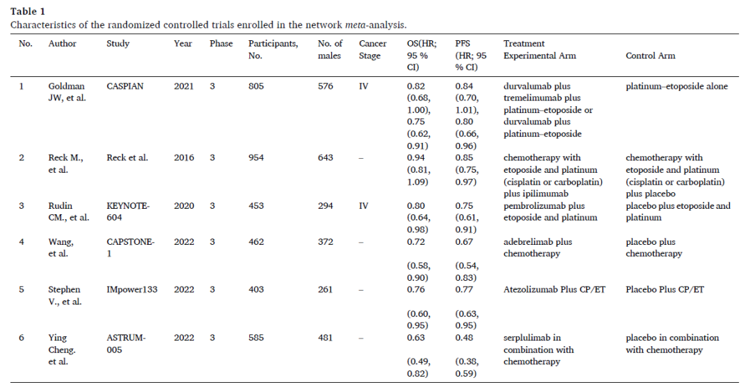 该研究共纳入6项符合要求的Ⅲ期随机对照研究(RCT)——CAPSTONE-1、ASTRUM-005、CASPIAN、IMpower133、KEYNOTE-604,以及一项伊匹木单抗+化疗的研究,针对6项研究的3662例ES-SCLC患者,评估了ICI对他们带来的生存获益和安全性,并探讨最适合的治疗方法。