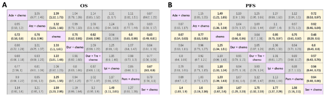 图.OS(A)、PFS(B)的汇总网状荟萃分析