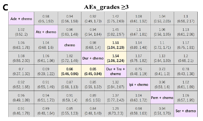 安全性分析显示:除度伐利尤单抗+Tremelimumab+化疗较单纯化疗(HR=1.51)和度伐利尤单抗+化疗(HR=1.54)更易引起≥3级AE外,其他免疫治疗联合化疗引起3级及以上不良事件的可能性相似。