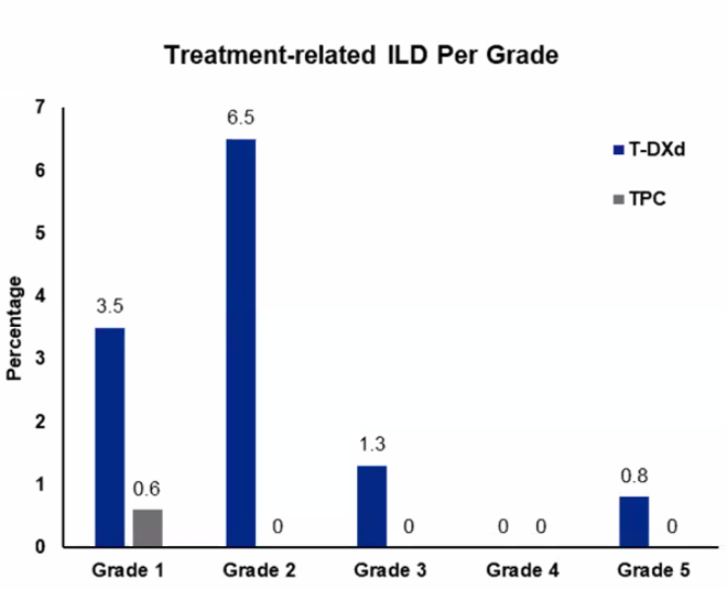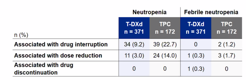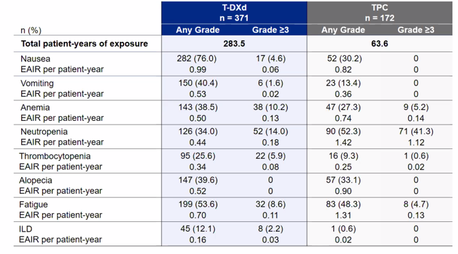至于其他药物不良反应,T-DXd还可能会引发恶心、呕吐(比恶心少见)等。相比医生选择的化疗(TPC),这些毒性在T-DXd治疗组中更少见。不过其他药物毒性,如中性粒细胞减少和发热性中性粒细胞减少症,则在TPC组更常见。我认为这与患者最困扰的事情有关——TPC治疗组需要使用更多的生长因子,以及因为中性粒细胞减少而导致的更多药物治疗剂量延迟。所以我认为关注这些具体的安全性分析有助于在临床实践中对患者进行治疗。