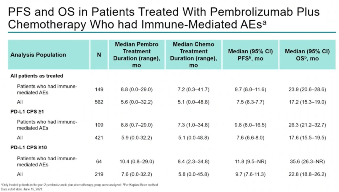 同时,我认为这证实了帕博利珠单抗可以作为此类出现疾病缓解的患者的维持治疗方案,让患者获得“化疗假期(Chemotherapy holiday)”,这能提升患者生活质量并减少化疗药物毒性。我们还研究了出现免疫介导的不良事件的患者,并试图了解免疫介导的不良事件对治疗结果的影响。在这个探索性的事后分析数据中我们可以看到,出现这些免疫介导不良事件的患者的中位PFS和OS要比整个患者群体的好。这是非常积极的数据。这种差异似乎不受PD-L1的影响,跟那些获得疾病缓解并提前停止化疗的患者实现治疗结果改善相类似。