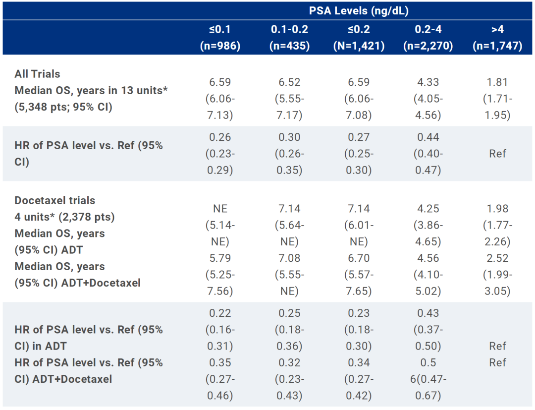 这次ASCO大会报道了一项汇总分析,纳入了13项研究,评估PSA水平在mHSPC患者OS方面的预测作用。结果显示,治疗7个月时PSA≤0.2ng/dL的患者OS相较于PSA 0.2-4ng/dL以及>4ng/dL的患者更长,ADT±化疗均是如此。