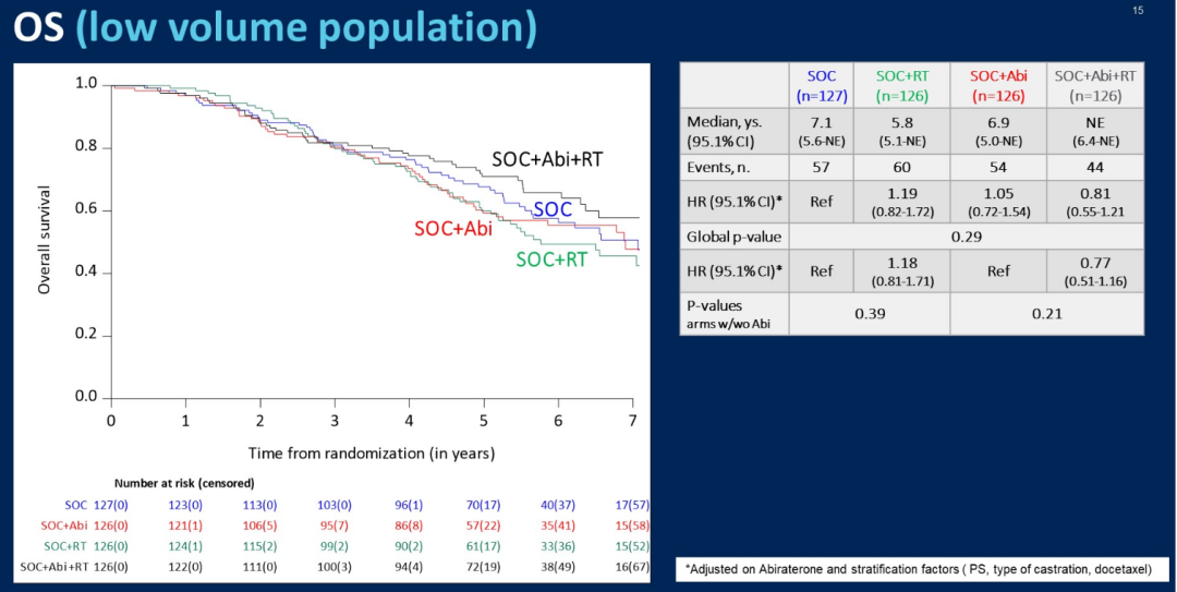 今年ASCO公布的PEACE-1研究最新数据也证实了放疗在低瘤负荷人群的治疗价值,尤其是放疗联合三联强化治疗,在低瘤负荷患者中,SOC(即ADT±化疗)+阿比特龙+放疗(SOC+Abi+RT)组患者的rPFS相较于SOC+Abi有显著延长(4.4 vs 7.5年,HR 0.50,P=0.02);但略有遗憾的是,两组间的OS没有显著差异(6.9年vs未达到,HR 0.77,P=0.21)。此外,SOC+Abi+RT可以显著延缓去势抵抗性进展(3.6 vs 6.9个月,HR 0.62,P=0.006)和减少严重生殖-泌尿事件(事件数:45 vs 24,P=0.018)。