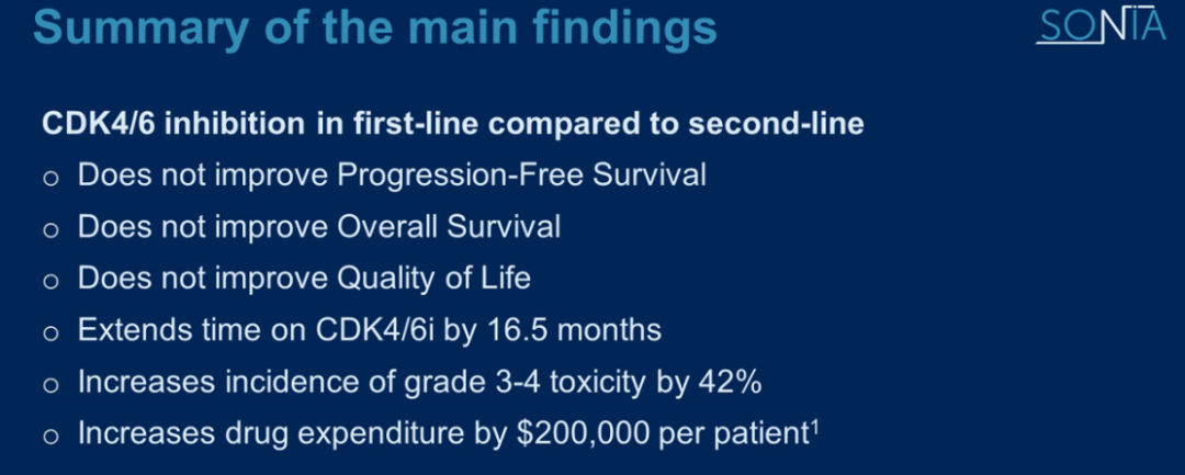 从SONIA研究中我们可以看到,一线治疗中NSAI+CDK4/6抑制剂对比单药NSAI是有PFS获益的,但是没有达到显著的统计学差异,因此,患者也没有达到总生存获益。SONIA研究中,有91%的患者应用的是哌柏西利,我认为患者没有得到总生存获益可能与治疗中应用的CDK4/6抑制剂种类有关。这正如刚才我提到的,在HR+晚期乳腺癌一线治疗中,不同研究中应用的CDK4/6抑制剂不同,患者的最终总生存获益情况也存在差异。患者后线治疗的最佳方案,也需要我们进行进一步的探索,最终使患者得到更好的生存获益。