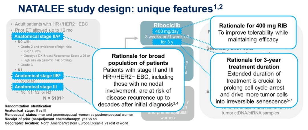 石晶教授:NATALEE研究的设计看似“简单粗暴”,即纳入人群更加宽泛,包括了一些无淋巴结转移的Ⅱ期至Ⅲ期患者,在传统内分泌治疗基础上联合或不联合瑞波西利辅助治疗。除此以外,该研究的治疗方案设计还有一些独到之处。首先,CDK4/6抑制剂(CDK4/6i)的疗程为3年,是目前几项CDK4/6i辅助治疗中疗程最长的。我个人认为这个用药设计是非常合理的,因为HR+/HER2-早期乳腺癌术后2~3年是第一个复发高峰期,过了这个高峰期后,患者仍存在长期的复发转移风险。在CDK4/6i之前,高危患者也往往需要进行OFS强化或延长TAM、AI治疗,高危患者延长CDK4/6i可能也有相似的潜在获益价值。