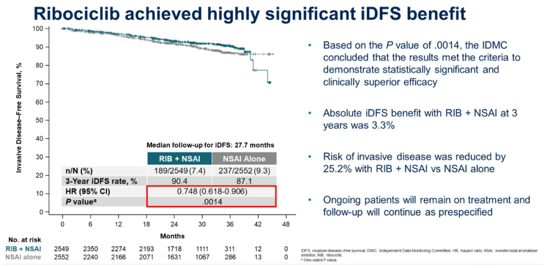 另一个设计亮点是瑞波西利的用量,将晚期解救治疗的标准用量600mg,改为早期辅助治疗的400mg,可以减少毒副反应,提高患者治疗依从性。当然,很多肿瘤科医生的第一反应是,减量在改善治疗耐受性的同时能否使疗效得到保证?实际上,2022年SABCS大会报道的一项AMALEE研究(作为MONALEESA-2适应证的补充研究)显示,在晚期一线治疗中,600mg和400mg瑞波西利治疗患者的PFS是相似的(24.5 vs.25.1个月,HR 1.07)。但600mg组患者的ORR更高(47.5%vs.55.2%)。因此,在晚期患者,尤其是需要获得更多肿瘤缓解的晚期患者中,我们依然应该推荐600mg剂量。而NATALEE研究结果也获得了阳性结果,在内分泌治疗基础上加入3年400mg的瑞波西利辅助治疗,可以显著改善患者iDFS(HR 0.748,P=0.014)。以上是我对NATALEE研究设计及结果的看法。