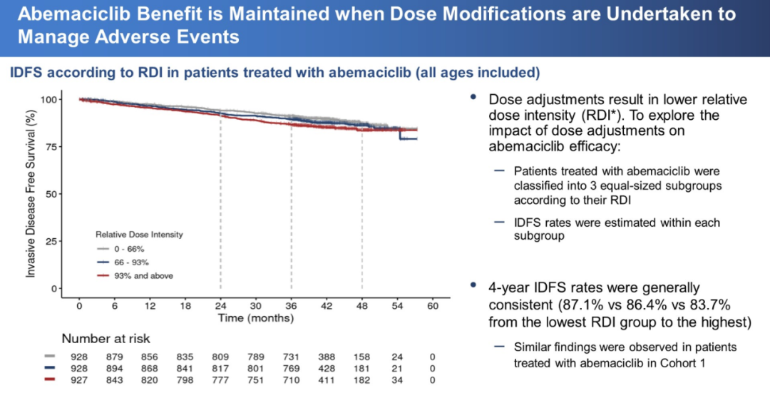 这种减量或停药在临床实践中是无法避免的,最重要的是由于毒副作用调整剂量以及短暂停药后,是否会影响疗效?该研究进一步分析显示,调整剂量的患者相较于未调整剂量的患者,其iDFS获益是一致的:在相关剂量强度(RDI)0~66%、66%~93%、≥93%的三组患者中,4年iDFS率分别为83.7%、86.4%和87.1%,当然最低RDI组患者的疗效在一定程度还是有所损失的。
