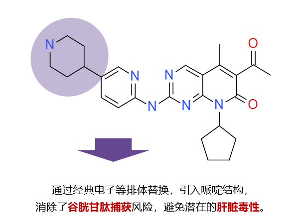 中国的新药研发虽起步较晚,但中国学者的探索从未停歇,并在不断追赶。2013年作为中国首个自主原研的高选择性CDK4/6抑制剂达尔西利(SHR6390)正式立项。结合中国人群特点,以临床需求为导向,中国学者开始专研CDK4/6抑制剂的药物结构优化,通过创新性引入哌啶基团,消除谷胱甘肽捕获效应,降低潜在患者肝脏安全性风险。