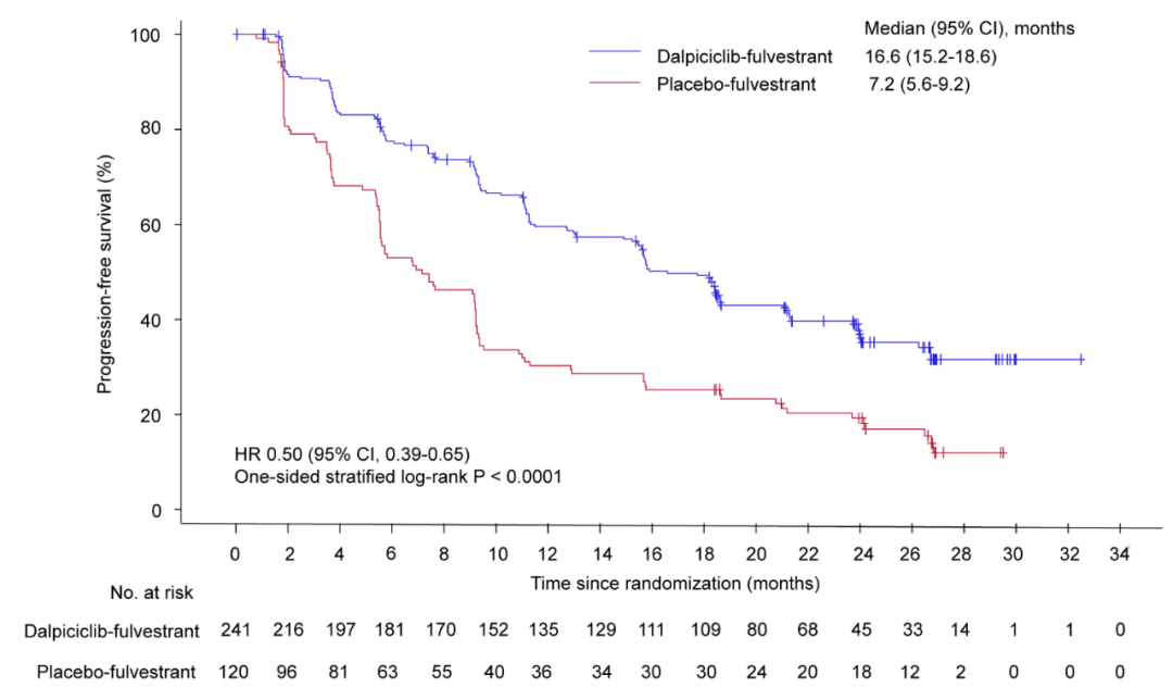 这些优势在DAWNA-1[1]和DAWNA-2[2]两项研究中也有体现。DAWAN-1研究是一项在既往内分泌治疗进展的HR+的晚期乳腺癌开展的Ⅲ期随机对照研究,对比了达尔西利联合氟维司群与单药氟维司群的疗效,结果显示,PFS延长9.4个月(16.6 vs. 7.2个月),HR=0.50,降低了50%的疾病进展风险,展现了达尔西利联合氟维司群在二线治疗绝对地位(图2)。该结果已经发表在《自然医学》(Nature Medicine,影响因子82.9)。