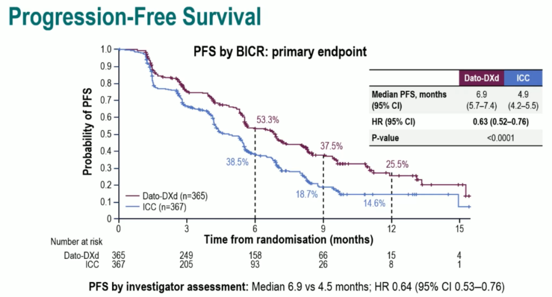 目前初步的结果非常喜人,Dato-DXd组和ICC组患者的中位PFS分别为6.9个月和4.9个月,Dato-DXd组患者的疾病进展或死亡风险相较于ICC组显著降低37%(HR 0.63,95%CI:0.52~0.76;P<0.0001)。目前该研究的OS数据尚未成熟,但Dato-DXd是靶向Trop-2的ADC药物,且药物抗体比更为优化,能够平衡疗效和毒性,且该药物能够发挥旁观者效应,更大程度杀死肿瘤细胞。从药物安全性方面来看,Dato-DXd组较ICC组骨髓抑制的发生率更低,所以我有信心并期待Dato-DXd未来会呈现出更震撼的结果。