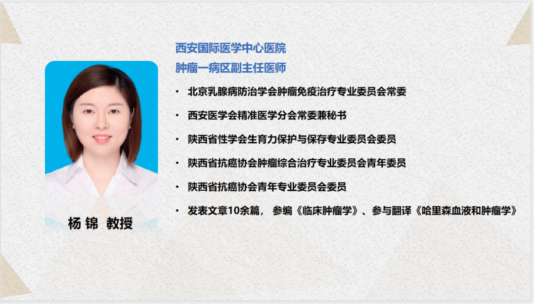 本期乳腺圆桌派,我们将邀请西安国际医学中心医院薛妍教授、汕头大学医学院附属肿瘤医院曾德教授、复旦大学附属肿瘤医院王磊苹教授、西安国际医学中心医院杨锦教授共同做客“云诊室”,就一例HR+/HER2低表达晚期乳腺癌患者的诊疗过程进行讨论。