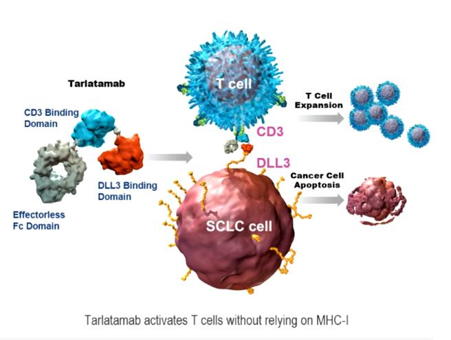 小细胞肺癌约占肺癌人群的15%,过去30年,含铂双药治疗一直是这部分患者的标准治疗,但患者预后较差,中位生存时间仅为一年左右,免疫检查点抑制剂的加入在一定程度上改善了这部分患者的预后,中位生存时间延长至15个月左右,但患者进展后,后线治疗选择十分有限。伊立替康或拓扑替康是这类患者的标准治疗,但疗效较差,中位PFS仅为3个月左右。今年ESMO年会,研究者公布了Tarlatamab在难治性小细胞肺癌患者中的疗效及安全性。Tarlatamab是一款双特异性连接子,其一端连接于CD3+的T淋巴细胞,另一端则连接于DLL-3阳性的肿瘤细胞表面,从而介导肿瘤细胞的裂解。