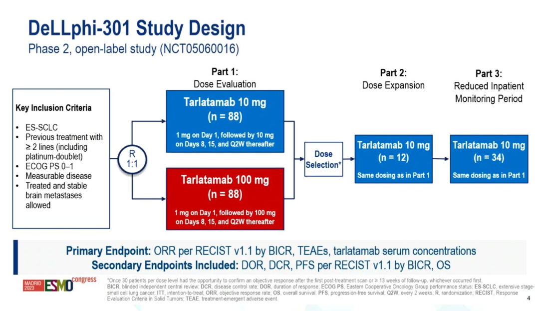 在这项II期、随机、双队列临床研究中,研究者纳入既往接受过铂类及一种其他治疗药物治疗的广泛期小细胞肺癌患者,随后按1:1的比例随机分为10 mg或100 mg治疗组,每组入组30例患者后进行中期分析,以选择后续推荐给药剂量。研究在第1周期第1天给予1mg研究药物治疗,随后给予10 mg或100 mg研究药物治疗。主要研究终点为ORR,次要研究终点包括DCR、DOR、PFS、OS、针对Tarlatamab抗体形成率等其他疗效参数。