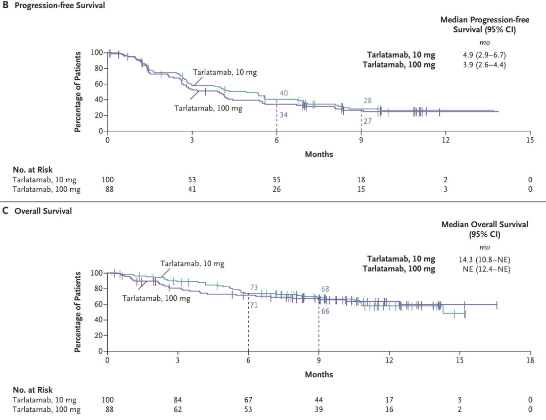 从安全性而言,最常见的不良反应为细胞因子释放(51%和61%),食欲下降(29%和44%),发热(35%和33%),便秘(27%和25%),贫血(26%和25%),3度及以上全因不良反应发生率分别为59%和64%,治疗相关3度及以上不良反应发生率分别为26%和33%,10 mg组有13%的患者因不良反应而导致治疗中断或剂量降低,而100 mg组这一比例为29%,10 mg组有1例患者因不良反应而导致死亡事件出现。