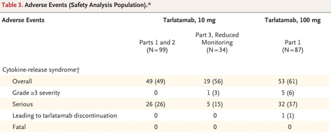 值得注意的是,该药物出现了既往临床试验中相对不常见的不良反应:细胞因子释放,因此研究者着重报道了细胞因子释放的相关不良反应。研究发现,10 mg组和100 mg组细胞因子释放发生率分别为51%和61%,但多数均为1度(30%和32%)或2度(20%和23%),且多数均出现在患者给药的第1周期或第2周期内,3度以上细胞因子释放发生率分别为1%和6%。细胞因子释放导致的最常见的症状分别为发热97%,低血压20%,低氧血症17%,给药后,中位至细胞因子释放综合征出现时间为13.1小时,中位持续时间为4天。多数细胞因子释放综合征可通过对症支持治疗,包括给予对乙酰氨基酚、静脉水化、糖皮质激素的应用得以解决。其他的干预措施包括给予托珠单抗(5%)、吸氧(8%)、血管活性药物使用(1%)等得以解决,98%的患者通过上述治疗措施,该不良反应得以解决。血液学毒性中,中性粒细胞降低发生率分别为17%和16%,3度以上粒细胞缺乏性发热发生率均为1%。