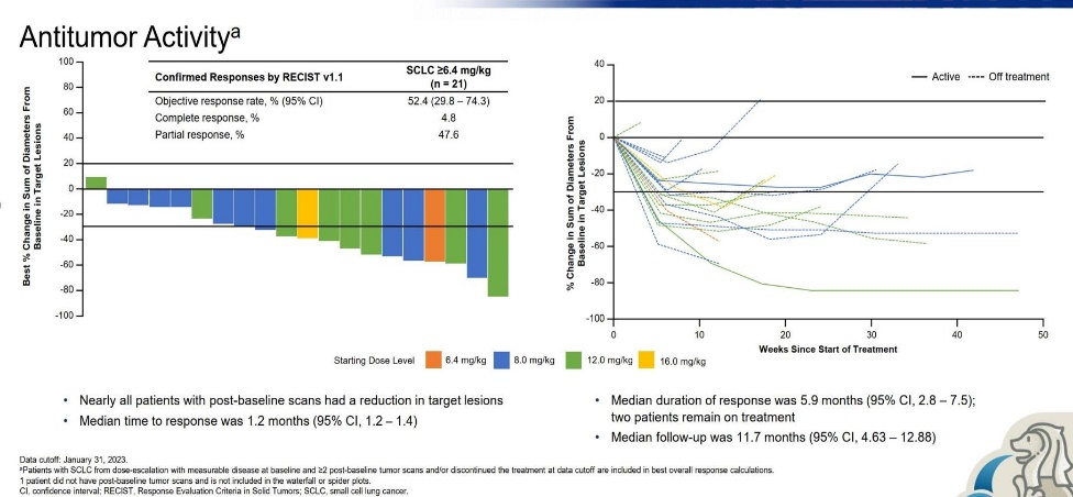 这项全球多中心研究从2021年12月第1例患者入组至2023年5月,共筛查222例患者,第1阶段中,10 mg组和100 mg组均入组88例患者,最终,独立审评委员会建议10 mg组作为后续扩展剂量,并额外纳入12例患者。两组中位随访时间分别为10.6个月和10.3个月,ORR分别为40%和32%。中位PFS分别为4.9个月和3.9个月,10 mg组6个月和9个月的PFS率分别为40%和28%,OS率分别为73%和68%;100 mg组6个月和9个月的PFS率分别为34%和27%,OS率分别为71%和66%。无论DLL-3阳性表达、阴性表达或表达不明,均观察到抗肿瘤活性。