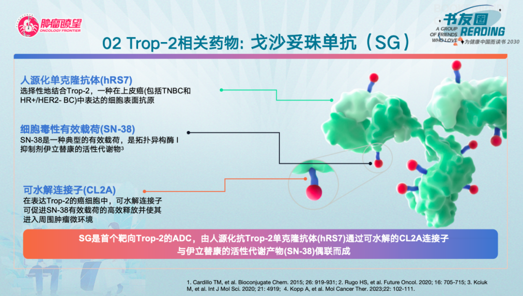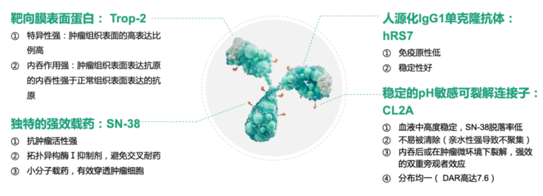 SG是首个靶向Trop-2的ADC,由人源化抗Trop-2单克隆抗体(hRS7)通过可水解的CL2A连接子与伊立替康的活性代谢产物(SN-38)偶联而成。