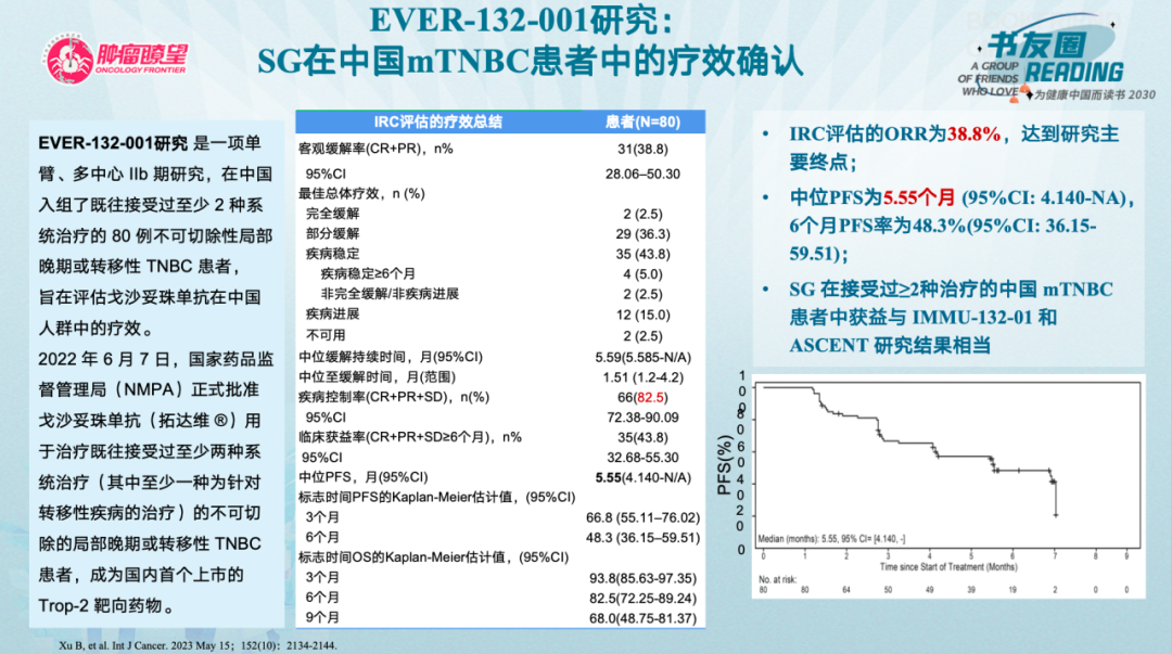 中国II期EVER-132-001研究中,SG用于80例既往接受过至少二线化疗失败的mTNBC患者,显示ORR 38.8%,DoR 5.59个月,PFS 5.55个月,OS未达到。基于此,SG获得中国NMPA批准用于治疗既往接受过≥2种系统治疗(二线及以上治疗)的、不可切除局晚期或mTNBC。