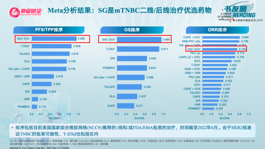 小结:TNBC预后差,仍存在较大未被满足的治疗需求;近年来,多种新型药物已被批准用于治疗TNBC,然而,大多数方案尚未进行直接对比。荟萃分析根据不同治疗线数确定mTNBC的最佳治疗方案,结果显示在二线/后线治疗方案中,SG在所有终点上的表现都优于该分析中的所有其他治疗(包括T-DXd);SG治疗相关不良事件较为常见且易管理。2023 ESMO HER2低表达BC共识推荐SG为优先选择方案。最新真实世界研究结果证实,mTNBC越早接受SG治疗,OS越长,进一步确认SG在mTNBC治疗中的重要地位。