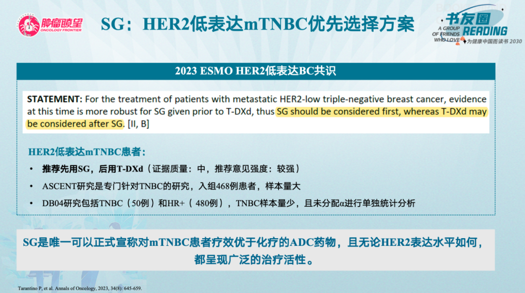 2023 ESMO HER2低表达BC共识指出,对于HER2低表达mTNBC患者,推荐先用SG,后用T-DXd(证据质量:中,推荐意见强度:较强)。