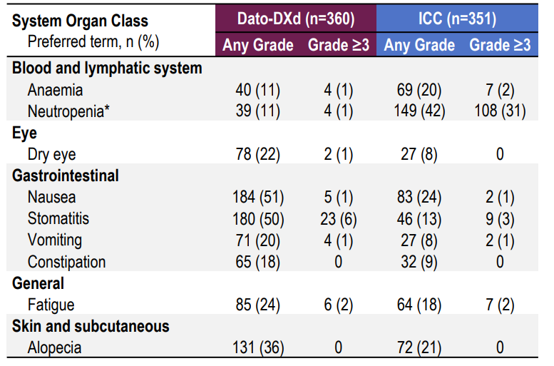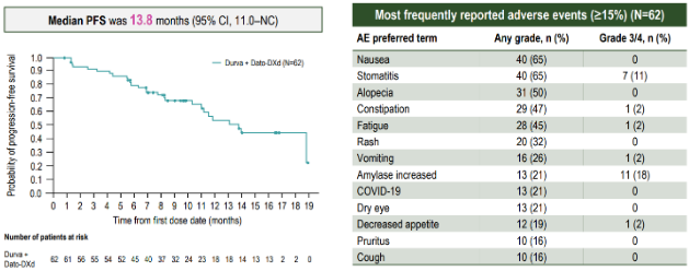 另一项Ib/II期BEGONIA平台研究则公布了第7队列(Arm7)的初步结果,仅纳入初治不可切除的局部晚期或转移性TNBC患者62例,Dato-Dxd+度伐利尤单抗确认的ORR为79%,mPFS为13.8个月。安全性方面主要的不良事件为恶心(65%)、口腔炎(65%)、脱发(50%)、便秘(47%)、疲劳(45%)等,不良事件谱中同样有干眼症的发生,另外有3例患者发生了治疗相关ILD/肺炎。该研究数据量较小,仍需更大规模数据验证[24]。此外本次ESMO会议中,Dato-DXd在非小细胞肺癌(NSCLC)也有相关研究披露。