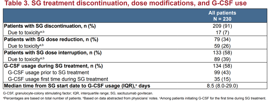 另一项真实世界研究回顾性收集了230名≥2线接受SG治疗mTNBC患者,其中二线患者34%、三线28%、4线19%、5线20%,中位随访时间为7.2个月。研究显示,二线中位rwOS为13.9个月(9.8-不可估计),三线中位rwOS为8.4个月(7.7-10.3),提示SG应用线序越前线,效果可能越好。在治疗过程中,患者未见新的不良事件,主要包括疲劳(45%)、中性粒细胞减少(33%)和腹泻(30%),临床管理策略比较成熟。整个随访期间,仅7%的患者因SG相关不良反应中断治疗,整体脱落率较低[15,16]