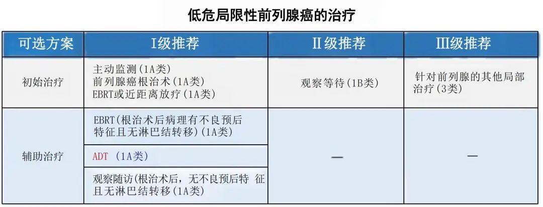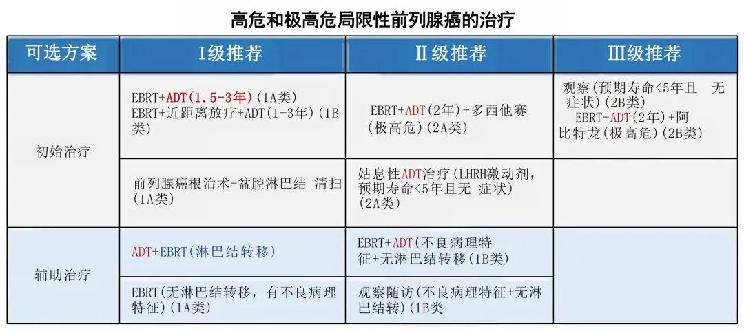 在早期前列腺癌的初始治疗或辅助治疗中,ADT目前仍然扮演着重要的角色。对于行根治性放疗的中高危患者需要联合6个月到3年不等的ADT治疗;对于行前列腺根治术的患者也可以接受ADT±EBRT辅助治疗,以降低疾病进展风险或术后复发转移风险。