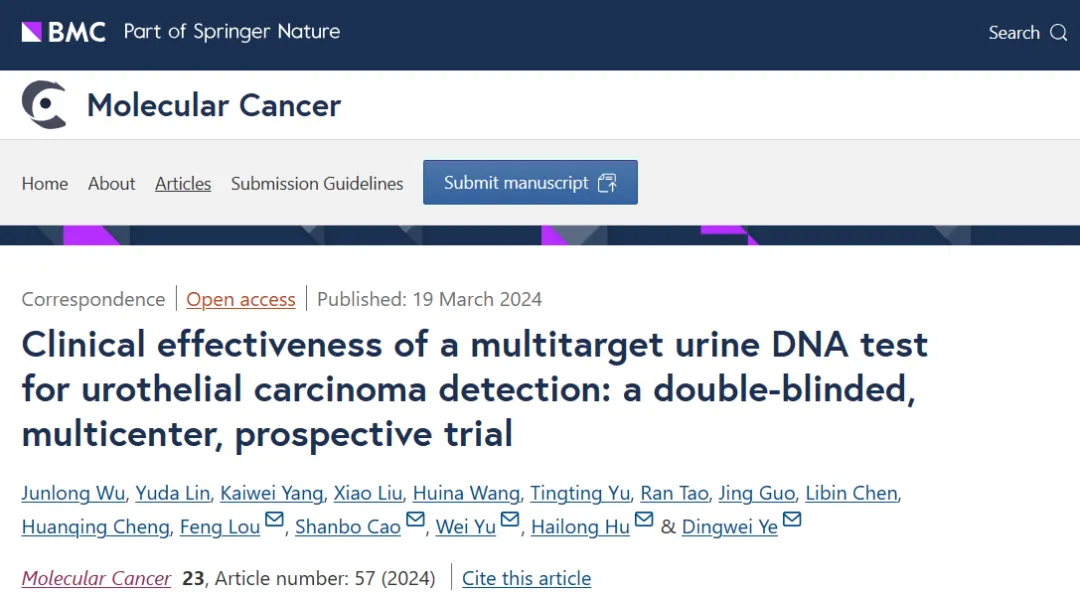 日前,从复旦大学附属肿瘤医院传来消息,该院泌尿外科叶定伟教授团队领衔发布的一项研究成果证实,一种基于尿液肿瘤DNA的无创诊断产品能有效早期发现尿路上皮癌,总体诊断敏感性达到91.37%,可有效提升尿路上皮癌的早发现率。权威学术期刊Molecular Cancer(《分子肿瘤》)在线刊登了这项成果,影响因子达37.3。