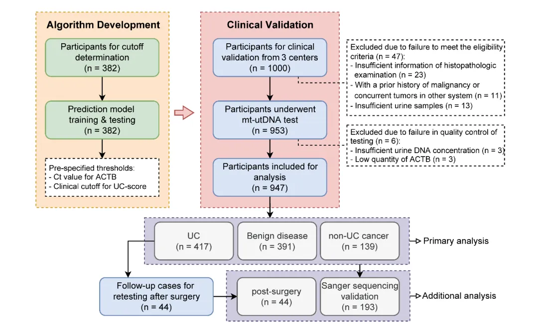 为了优化尿路上皮癌的早期诊断策略,由叶定伟教授团队领衔,联合北京大学第一医院、天津医科大学第二医院、北京橡鑫生物科技有限公司团队,开发了一种基于尿液肿瘤DNA(utDNA)的尿路上皮癌无创诊断产品(UI Seek),并开展全国多中心前瞻性临床研究进行验证。