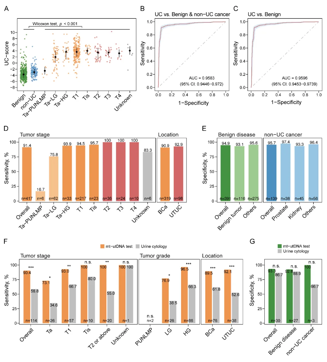 值得注意的是,UI Seek能够同时早期检出膀胱癌和上尿路上皮癌,灵敏度分别为90.9%和92.9%。此外,对于良性泌尿系统疾病(良性肿瘤、炎症等)或非尿路上皮癌的恶性肿瘤(前列腺癌、肾癌等),研究并没有观察到明显的干扰效应。在比较分析中,与既往的尿细胞学、NMP22和FISH相比,UI Seek的灵敏度显著提高,并且特异性与上述检测相当。
