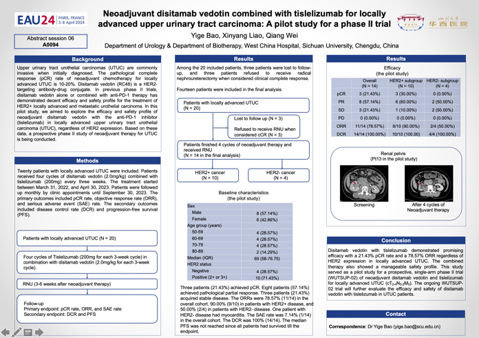 方法:纳入的患者接受了每3周1次的4个周期的维迪西妥单抗(2.0 mg/kg)联合替雷利珠单抗(200 mg)。治疗于2022年3月31日至2023年4月30日开始。患者每月接受门诊随访,直至2023年9月30日。主要观察指标包括pCR率、客观缓解率(ORR)和严重不良事件(SAE)发生率。次要结局指标包括疾病控制率(DCR)和无进展生存期(PFS)。