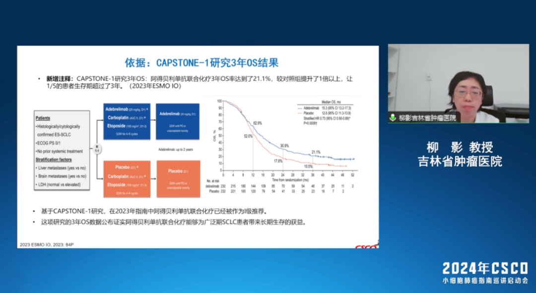 吉林省肿瘤医院柳影教授就SCLC内科治疗部分进行了细致分享。柳教授指出,目前阿得贝利单抗研究(CAPSTONE-1研究)更新公布了其3年OS结果:3年OS率达到了21.1%,这意味着有1/5的患者生存期超过了3年。此外,二线治疗部分,指南注释部分更新芦比替丁联合阿替利珠单抗作为ES-SCLC二线治疗。注释部分也更新了Tarlatamab治疗复发小细胞肺癌的2期研究结果和靶向B7-H3的ADC研究结果等。