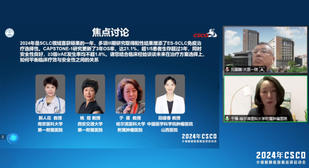 在柳影教授精彩演讲后的讨论中,西安交通大学第一附属医院姚煜教授和南京医科大学第一附属医院郭人花教授均指出,免疫治疗药物如阿得贝利单抗和支持治疗药物的研究数据的大量更新,可以看出这些药物不仅显著延长了SCLC患者的缓解期,还为临床治疗增添了更多治疗选择。另外,哈尔滨医科大学附属肿瘤医院于雁教授中国医学科学院肿瘤医院山西医院段建春教授强调,在免疫治疗联合用药方面,应充分考虑个体化用药原则,平衡患者的个体状况、药物疗效与安全性,以实现患者治疗效果的最大化。